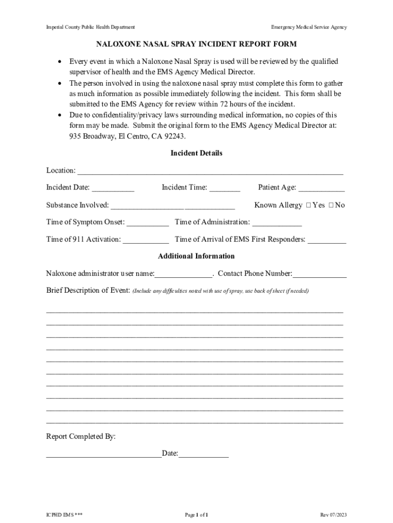 To fill out a naloxone nasal spray incident report, one must provide details including the date and time of the incident, the location, the individuals involved, the amount of naloxone administered, the response observed, and any subsequent medical actions taken.