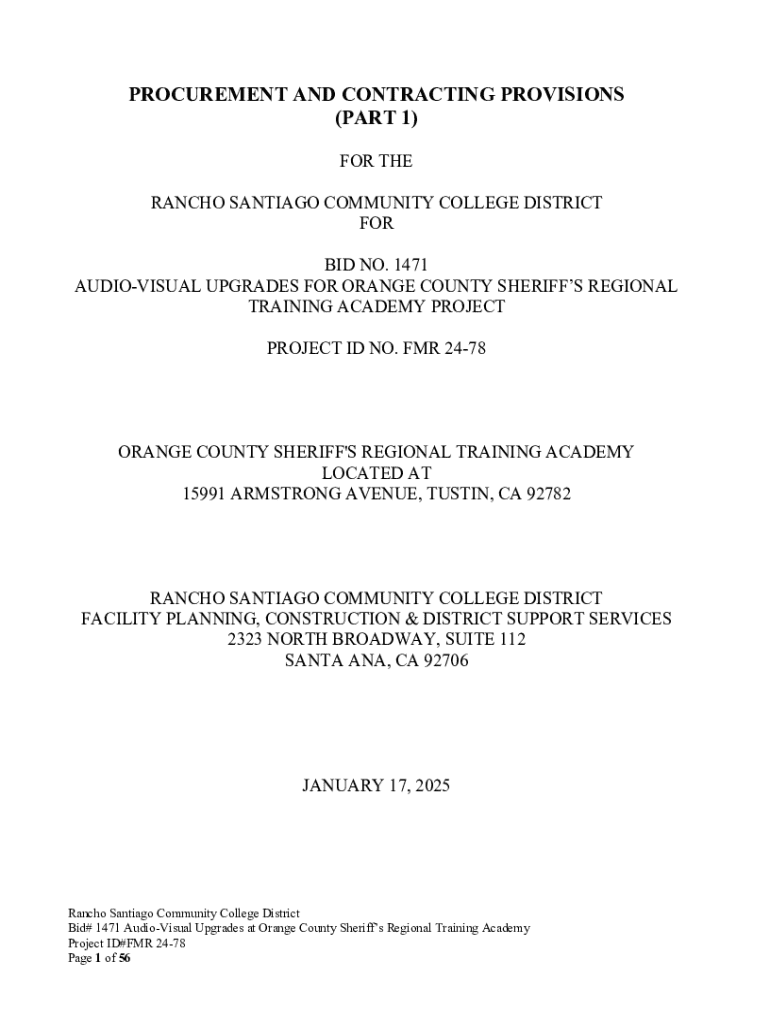 This document outlines the bidding and contracting provisions for the Audio-Visual Upgrades Project at the Orange County Sheriff’s Regional Training Academy, detailing the requirements, procedures,