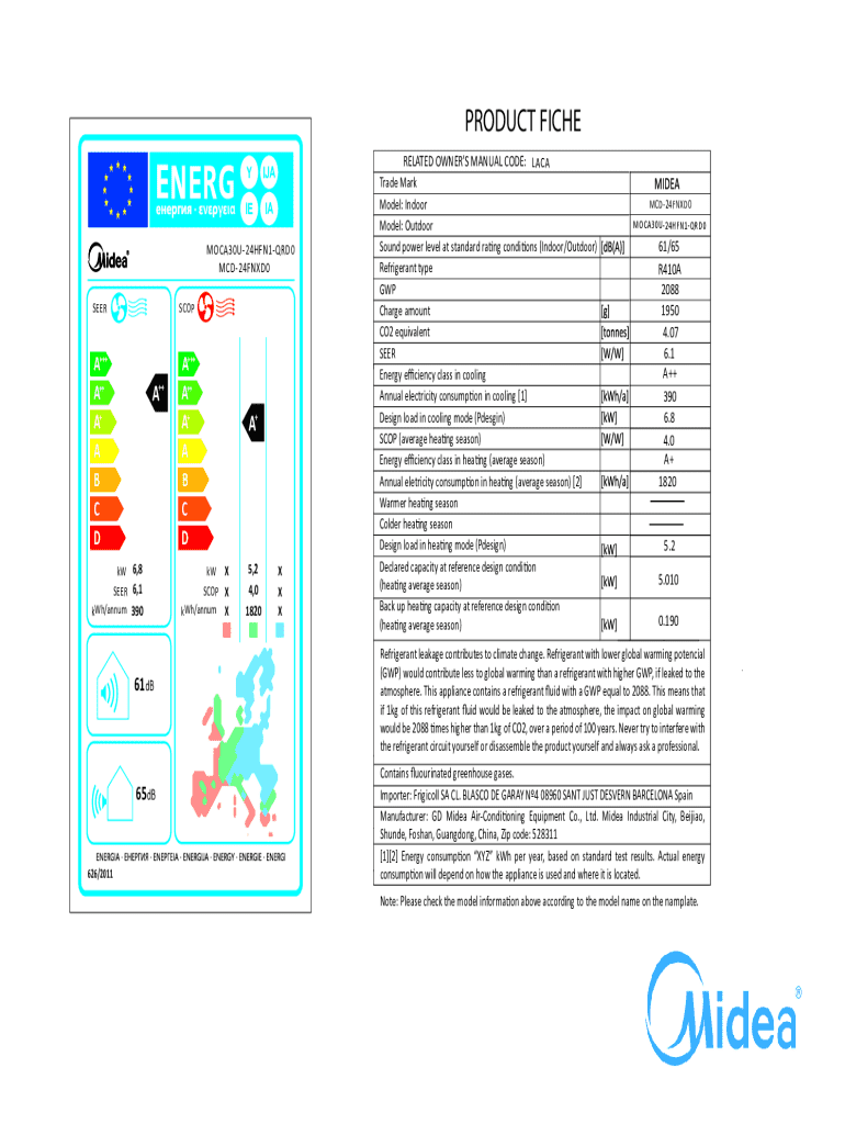 PRODUCT FICHEEYIJAIEIAMOCA30U24HFN1QRD0 MCD24FNXD0 SEERSCOPA+++ A++ A+ A B C DA+++ A++ A+ A B C DA++kW 6,8SEER 6,1 Wh/annum 390 k61dB65dB626/2011A+X SCOP X Wh/annum k X kW5,2 4,0 1820X X XRELATED