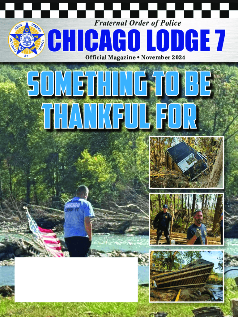 This magazine features stories and reports from Chicago Lodge 7, highlighting community contributions, member recognition, and ongoing support for law enforcement, including disaster relief efforts