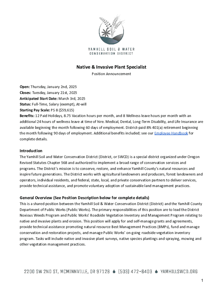 This document announces the availability of the Native & Invasive Plant Specialist position at the Yamhill Soil and Water Conservation District, detailing job responsibilities, application requirements,