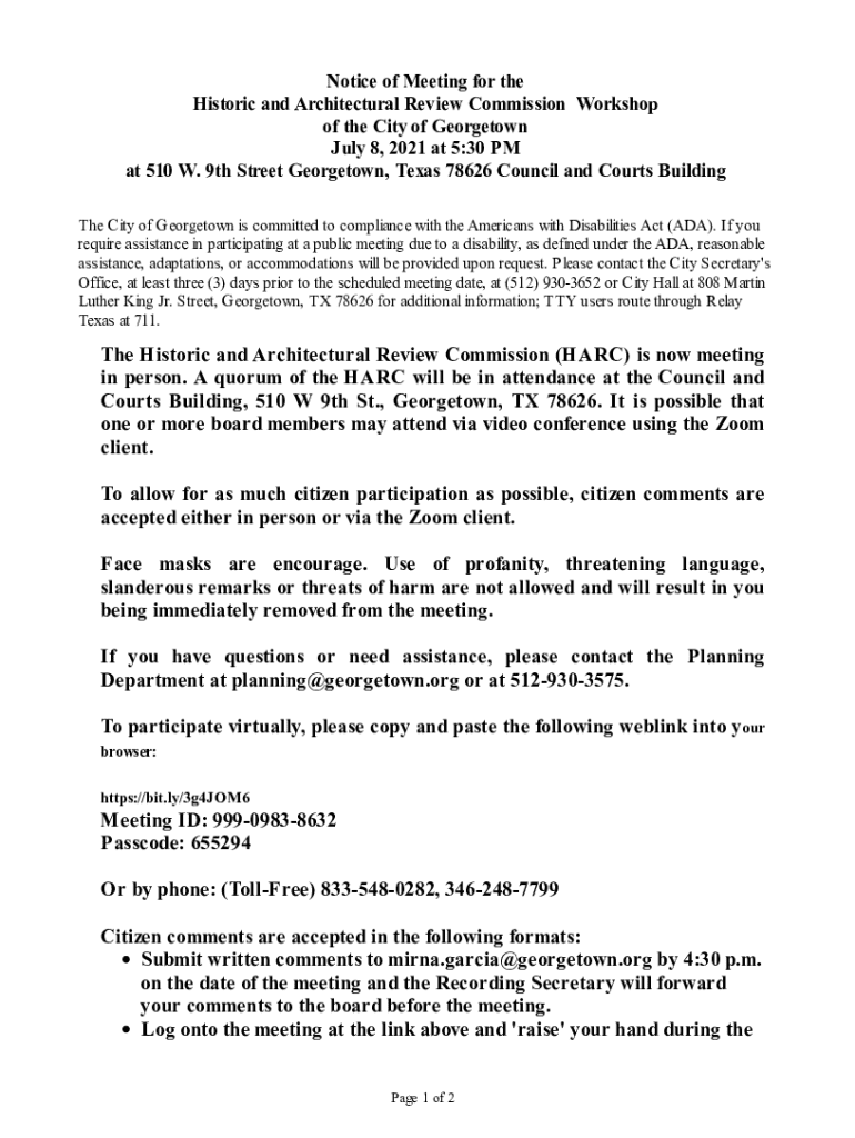 Notice for the Historic and Architectural Review Commission Workshop scheduled for July 8, 2021, at the Council and Courts Building in Georgetown, Texas. The meeting includes information on how citizens