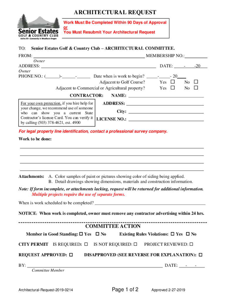 To fill out an architectural request, gather necessary details about the project, complete the required forms by providing project descriptions, site plans, and drawings, and submit the request to the relevant governing body or architectural review board.