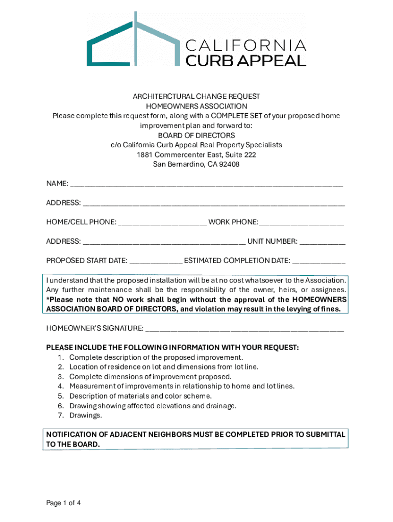 This form is used by homeowners to submit requests for changes or improvements to their property. It includes the need for detailed plans, neighbor notifications, and the requirement for approval