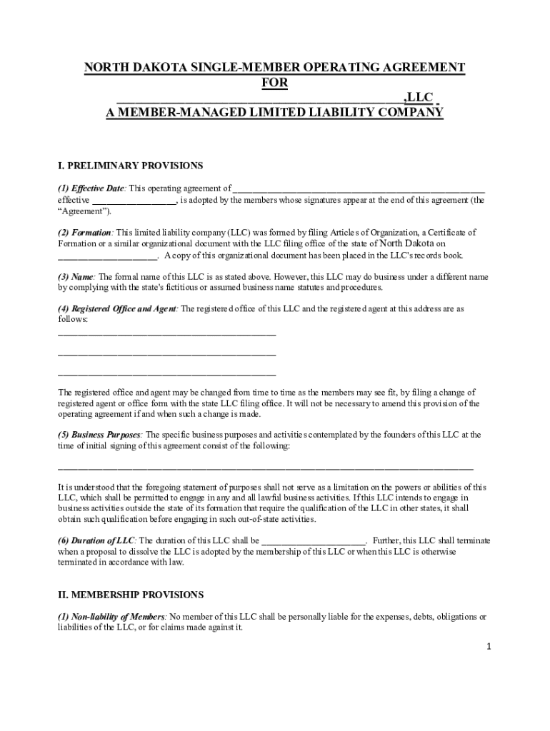 This document serves as an operating agreement for a single-member limited liability company (LLC) formed in North Dakota. It outlines preliminary provisions, membership provisions, tax and financial