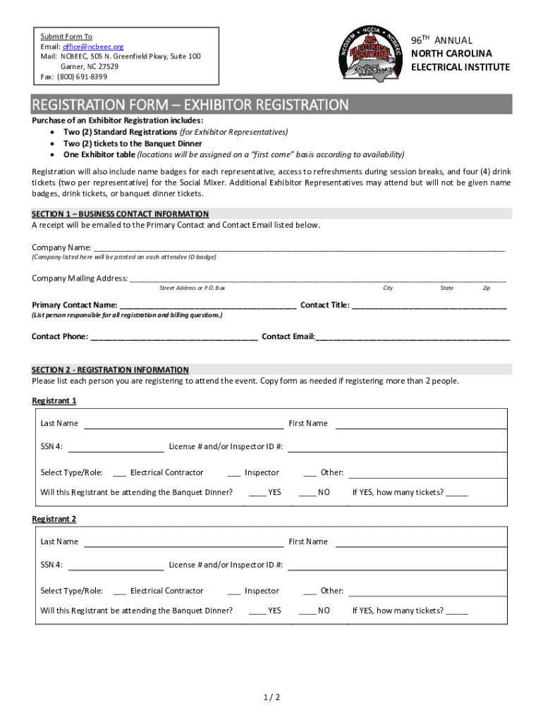 This form is used to register exhibitors for the 96th Annual North Carolina Electrical Institute. It includes sections for business contact information, registration information for each representative,