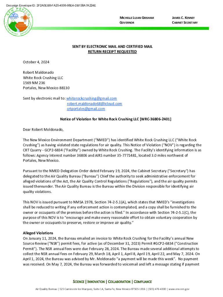 Get the free Notice of Violation for White Rock Crushing Llc