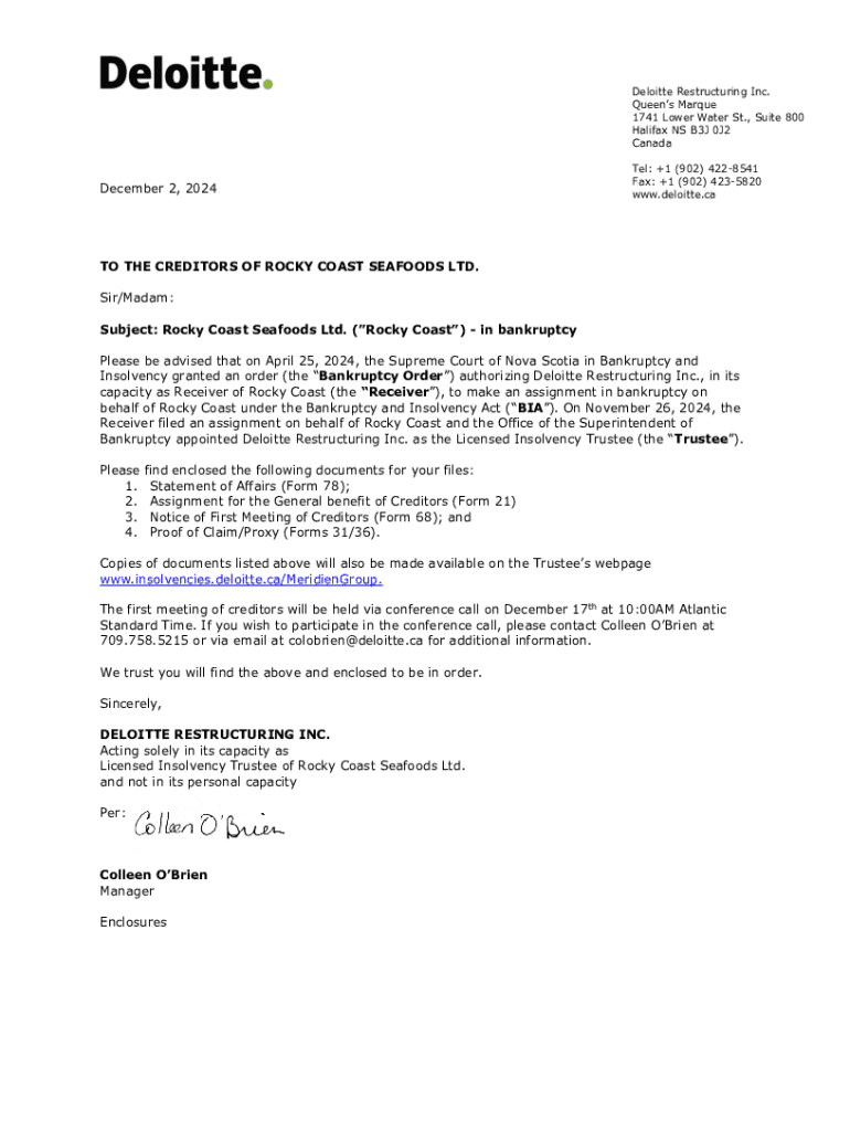 This document provides notice to the creditors of Rocky Coast Seafoods Ltd. regarding the bankruptcy proceedings and the first meeting of creditors. It details the appointment of Deloitte Restructuring