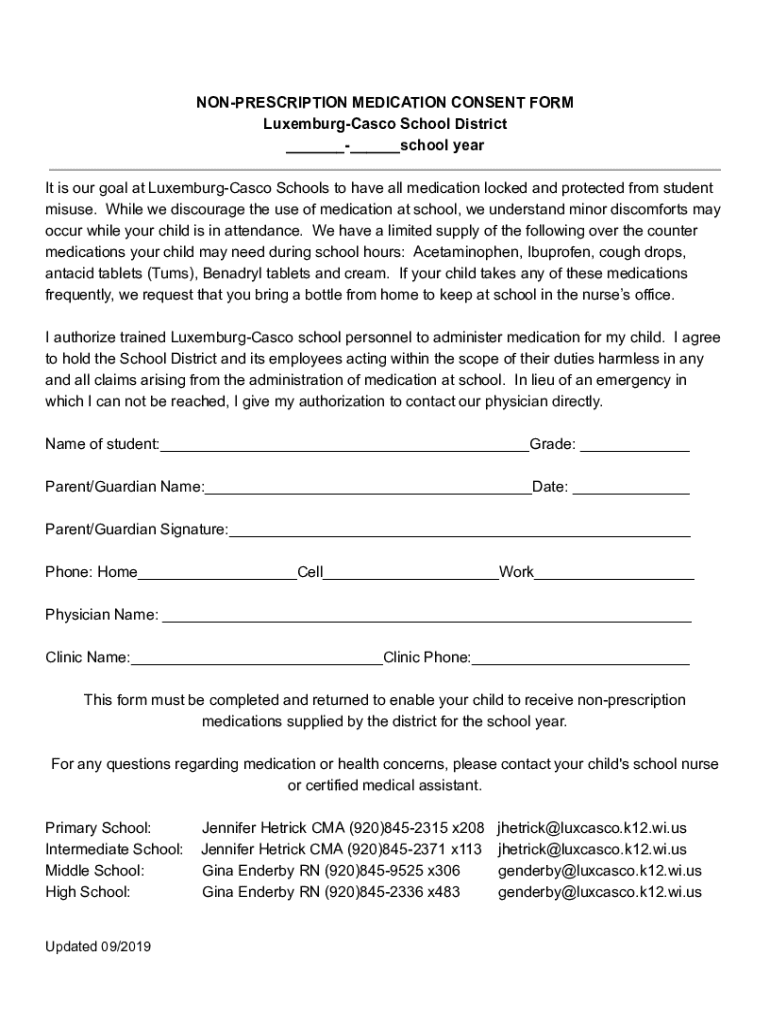 This form is used by the Luxemburg-Casco School District to obtain parental consent for the administration of non-prescription medications to students during school hours. It includes authorization