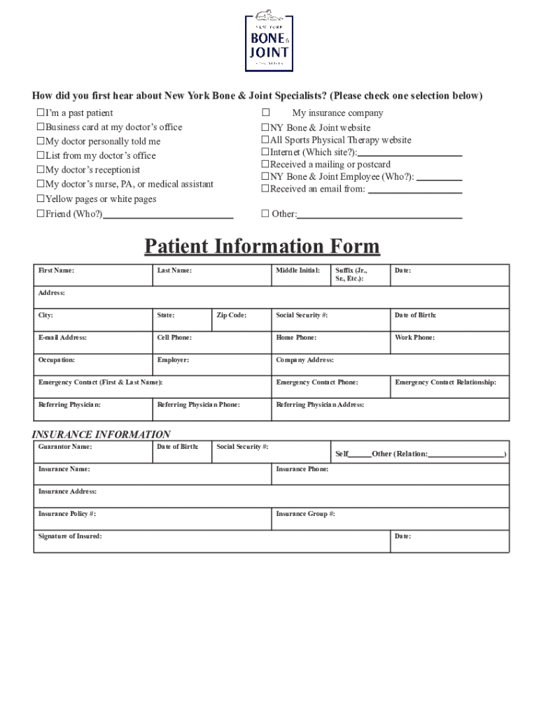 Este documento recopila información del paciente sobre sus antecedentes médicos, información de seguros y detalles sobre el tratamiento recibido en New York Bone & Joint Specialists.