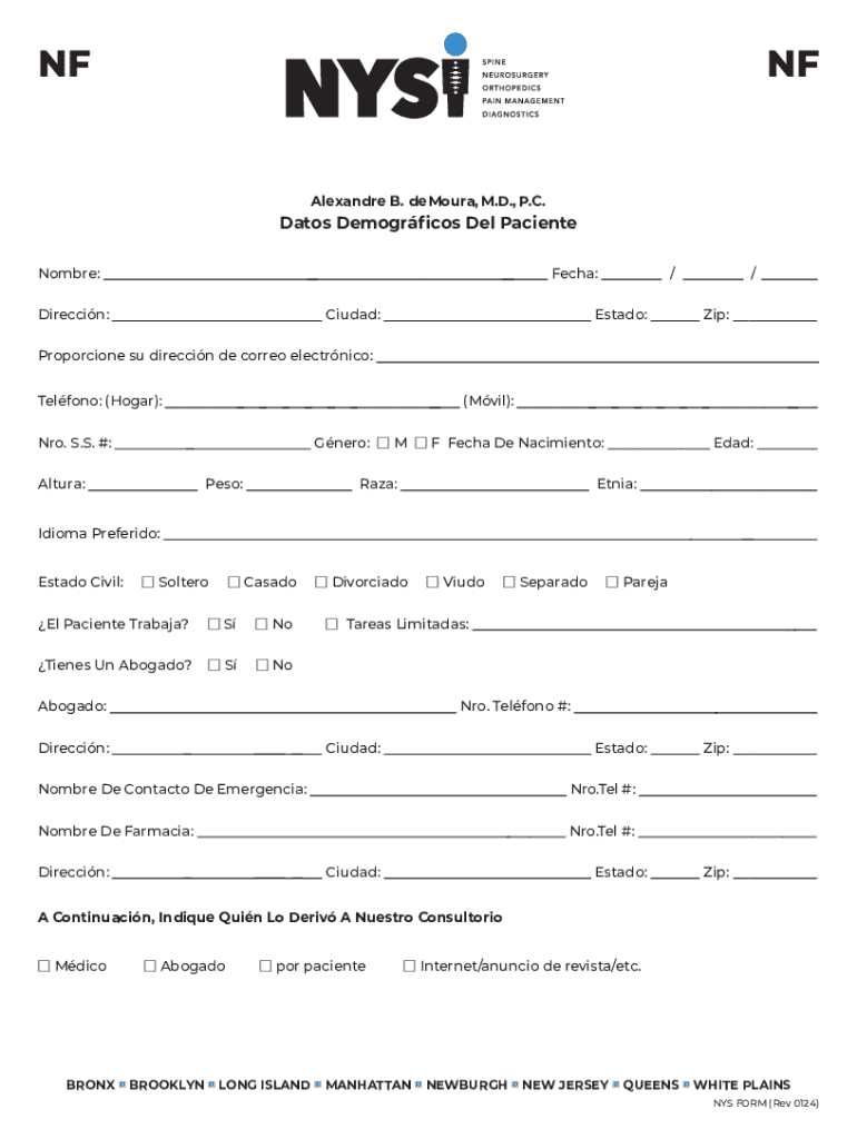 Este formulario recopila información demográfica y de seguro para pacientes que reciben atención en el New York Spine Institute. Incluye detalles sobre el paciente, su abogado, su historial médico,