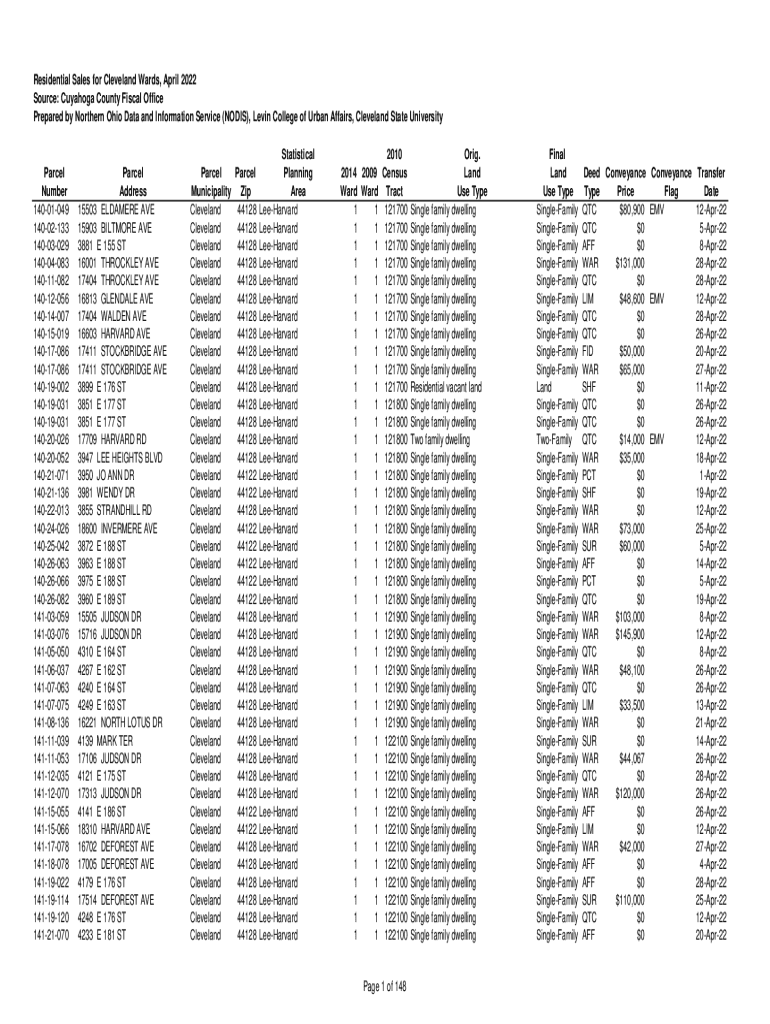 Residential Sales for Cleveland Wards, April 2022 Source: Cuyahoga County Fiscal Office Prepared by Northern Ohio Data and Information Service (NODIS), Levin College of Urban Affairs, Cleveland State