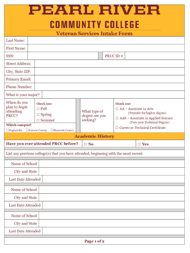 Este formulario es utilizado para recopilar información de admisión de veteranos en Pearl River Community College, incluyendo datos personales, historial académico y beneficios de educación VA.