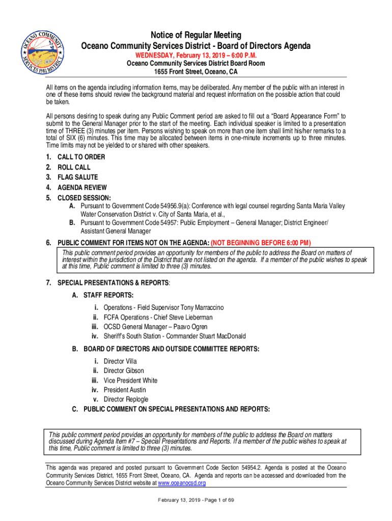 This document contains the agenda for the Oceano Community Services District\'s Board of Directors Meeting, outlining the schedule, discussion topics, public comment periods, and special presentations.