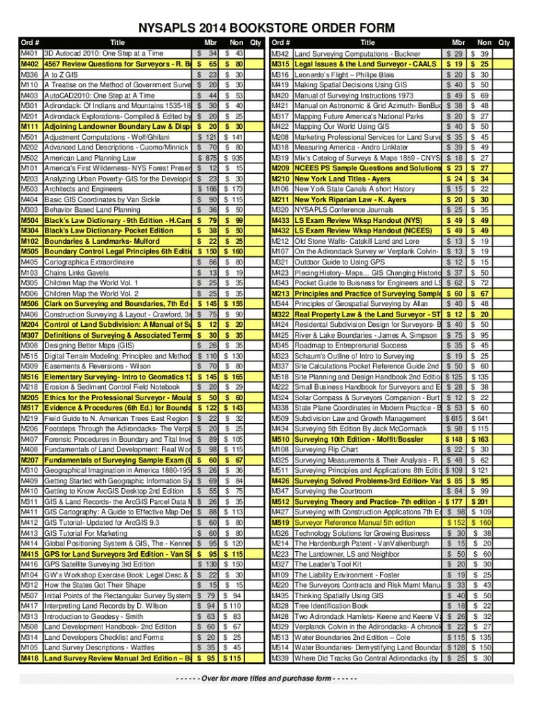 Members of the New York State Association of Professional Land Surveyors or individuals seeking to obtain educational materials related to land surveying are typically required to file the NYSAPLS 2014 bookstore order.