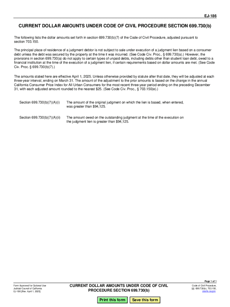 This document lists the adjusted dollar amounts under section 699.730(b)(7) of the Code of Civil Procedure, effective April 1, 2025, highlighting conditions under which the principal place of residence
