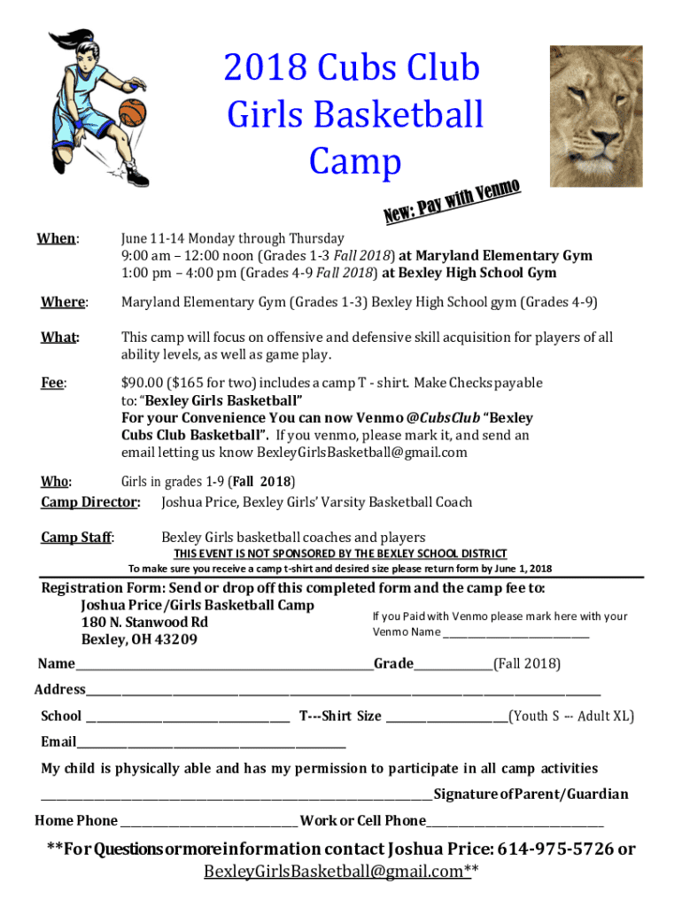 A registration form for the 2018 Cubs Club Girls Basketball Camp taking place from June 11-14. The camp aims to enhance offensive and defensive skills for girls in grades 1-9, conducted by Bexley