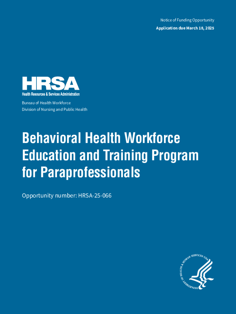 Este documento es un aviso de oportunidad de financiamiento que detalla el programa de educación y capacitación de la fuerza laboral en salud conductual para paraprofesionales. Proporciona información