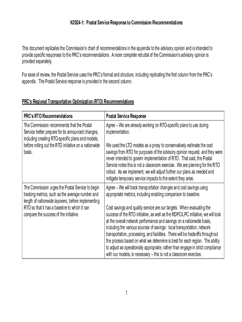 N20241: Postal Service Response to Commission RecommendationsThis document replicates the Commissions chart of recommendations in the appendix to the advisory opinion and is intended to provide specific