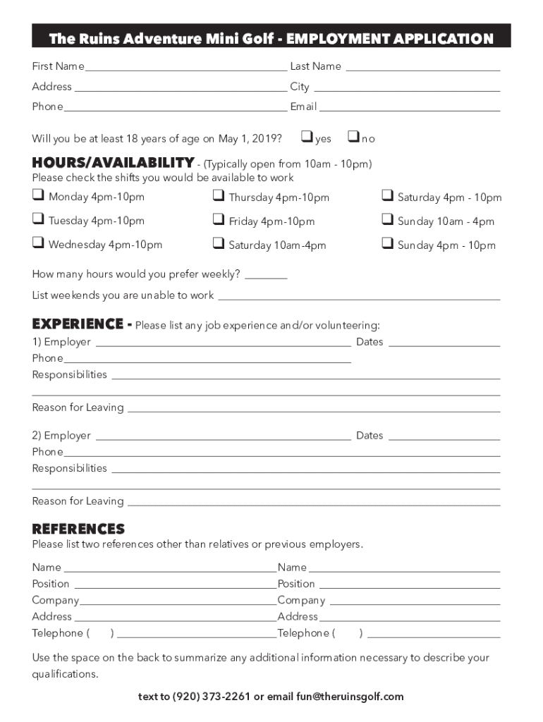 Application form for prospective employees of The Ruins Adventure Mini Golf, including sections for personal information, availability, work experience, and references.