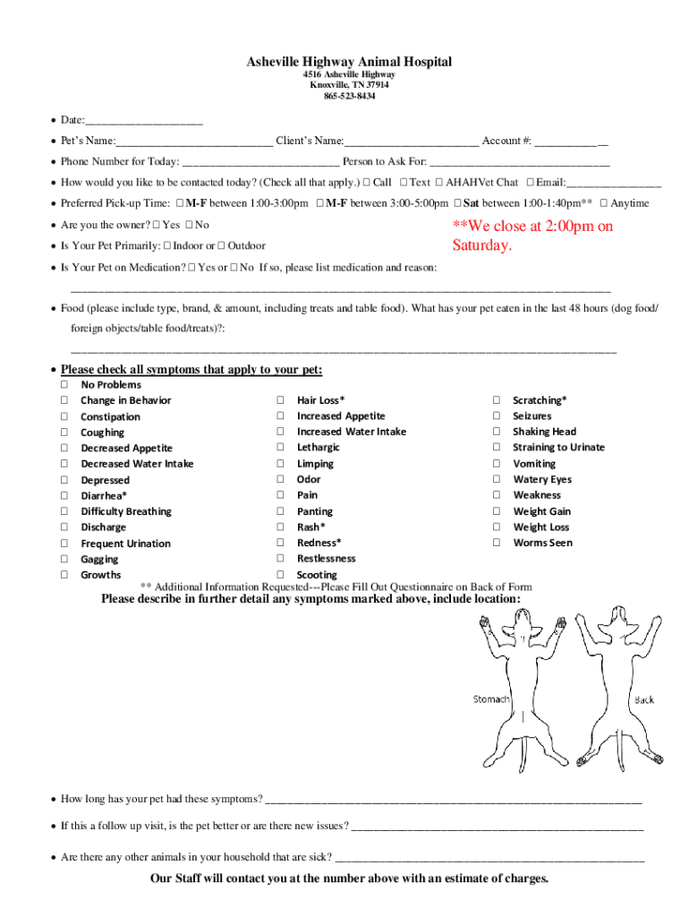 To fill out the forms for Asheville Highway Animal Hospital, pet owners should provide their personal information, pet details, medical history, and any other required documentation as instructed by the hospital.