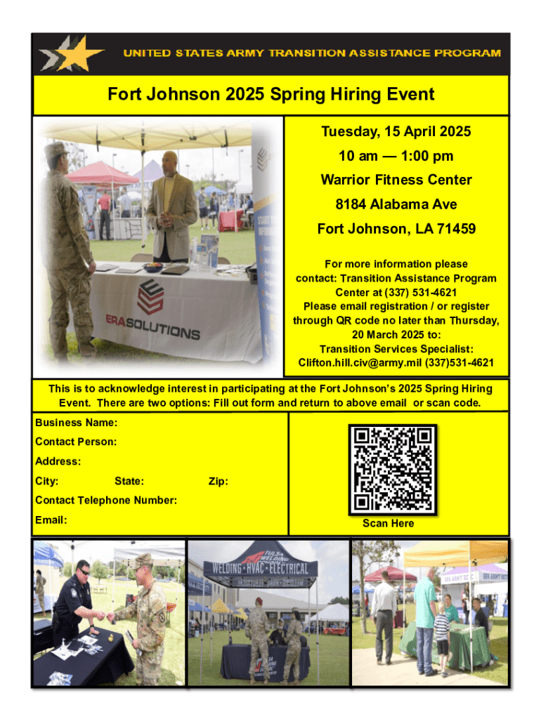 This document serves as a registration form for the Fort Johnson Spring Hiring Event scheduled for 15 April 2025. Participants can register via email or QR code.