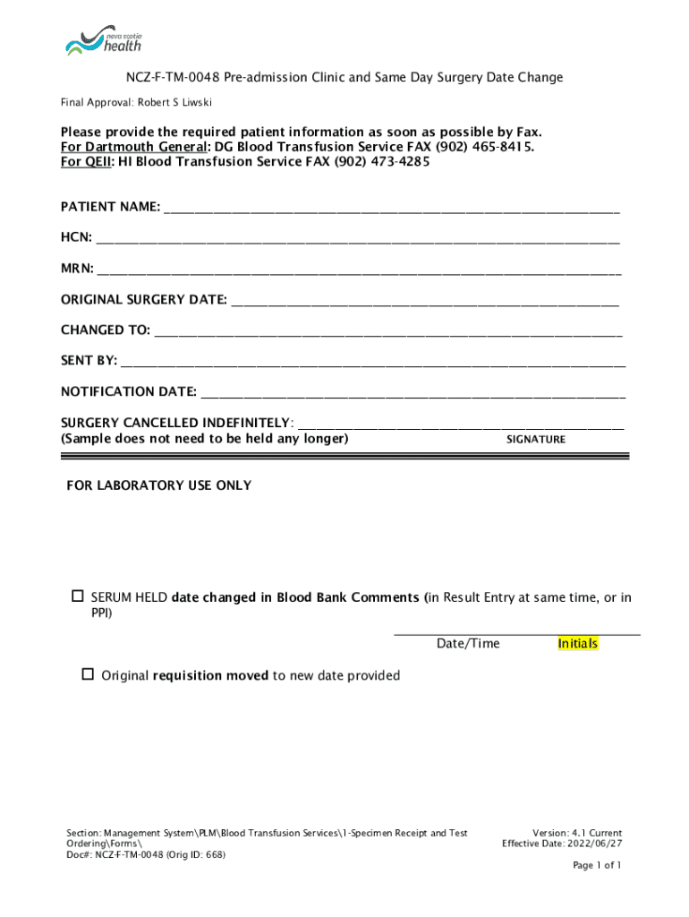 This form is used to communicate changes to the surgery date for patients, including necessary patient information and notification details.