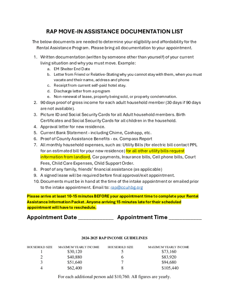 Rap move-in assistance documentation refers to the paperwork required to apply for financial help for housing expenses associated with moving into a new residence.