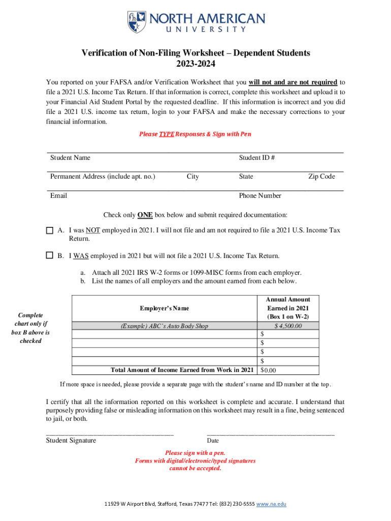 Get the free Verification of Non-filing Worksheet