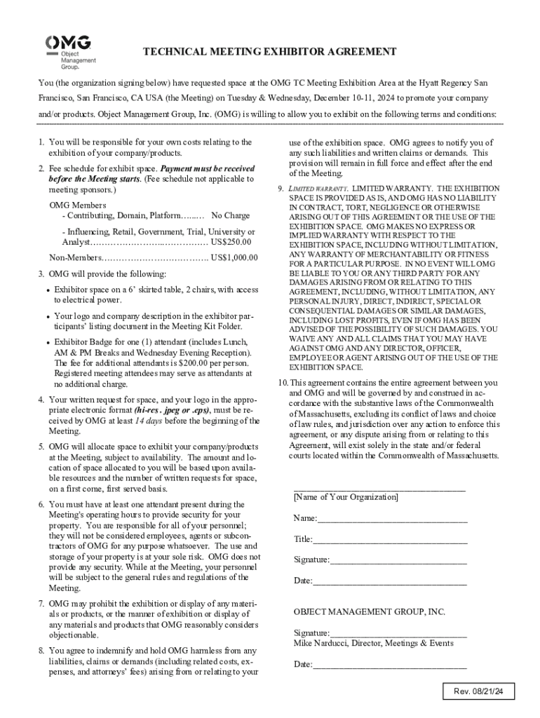 This document serves as an agreement for organizations wishing to exhibit at the OMG TC Meeting Exhibition Area, detailing space allocation, costs, responsibilities, and terms of indemnification.