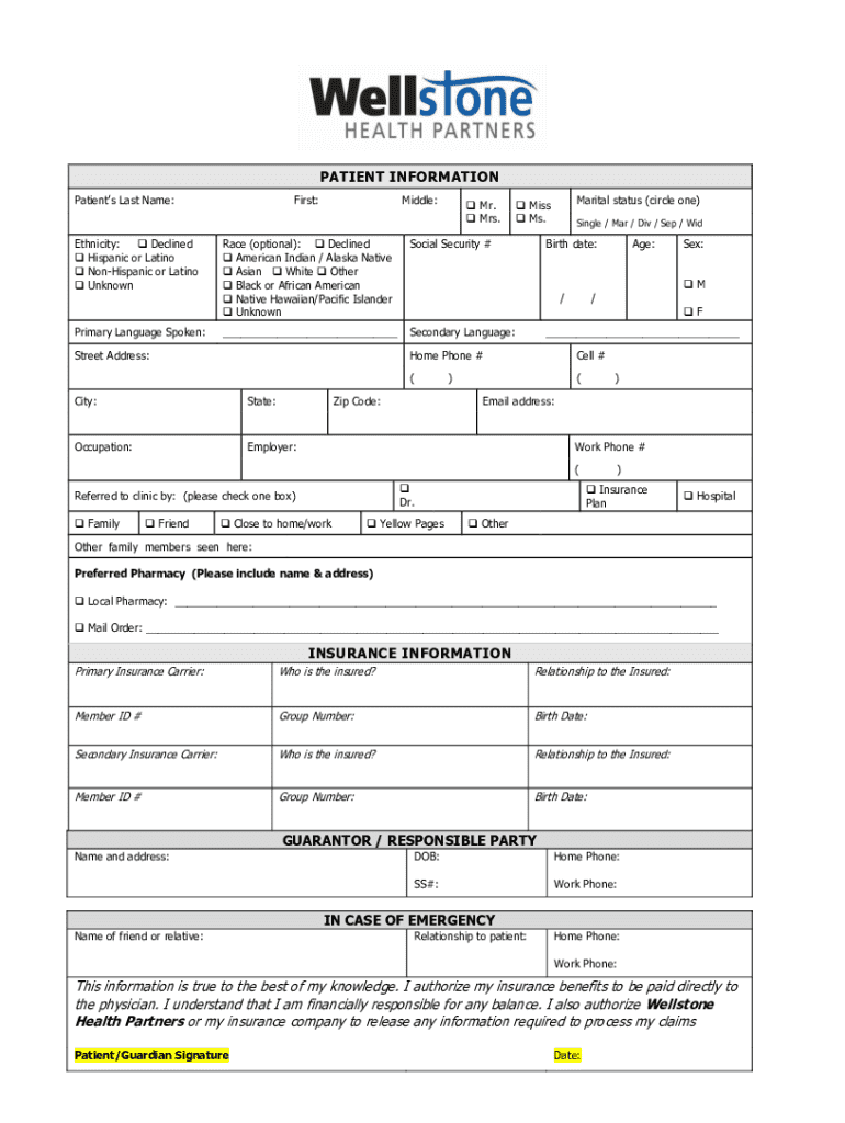 Este formulario recoge información personal, historial médico, y autorización de divulgación para los pacientes de Wellstone Health Partners.