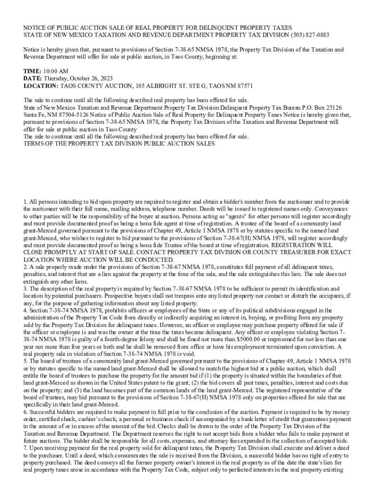 Este documento notifica que, de acuerdo con las disposiciones de la Sección 7-38-65 NMSA 1978, la División de Impuestos sobre Propiedades del Departamento de Hacienda y Rentas de Nuevo México ofrecerá