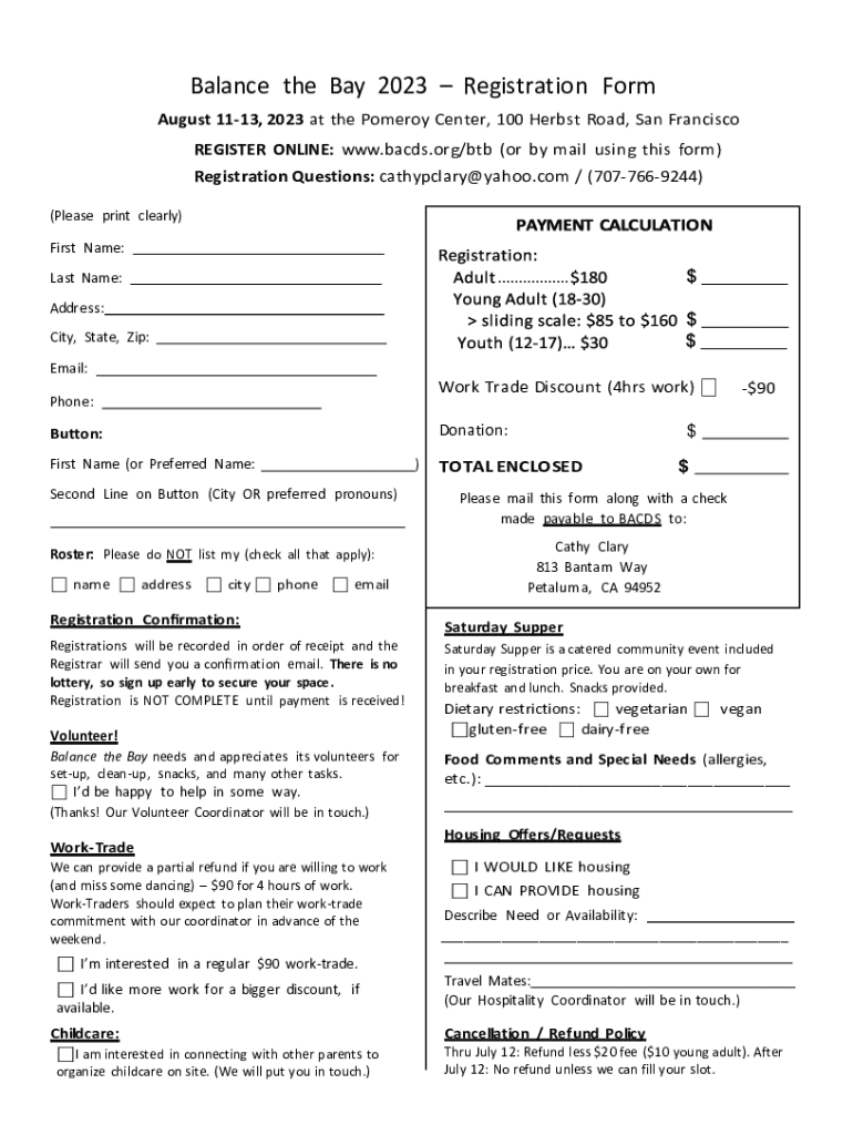 Formulario de registro para Balance the Bay 2023, que se llevará a cabo del 11 al 13 de agosto en el Pomeroy Center, San Francisco. Incluye información sobre la inscripción, descuentos por trabajo,