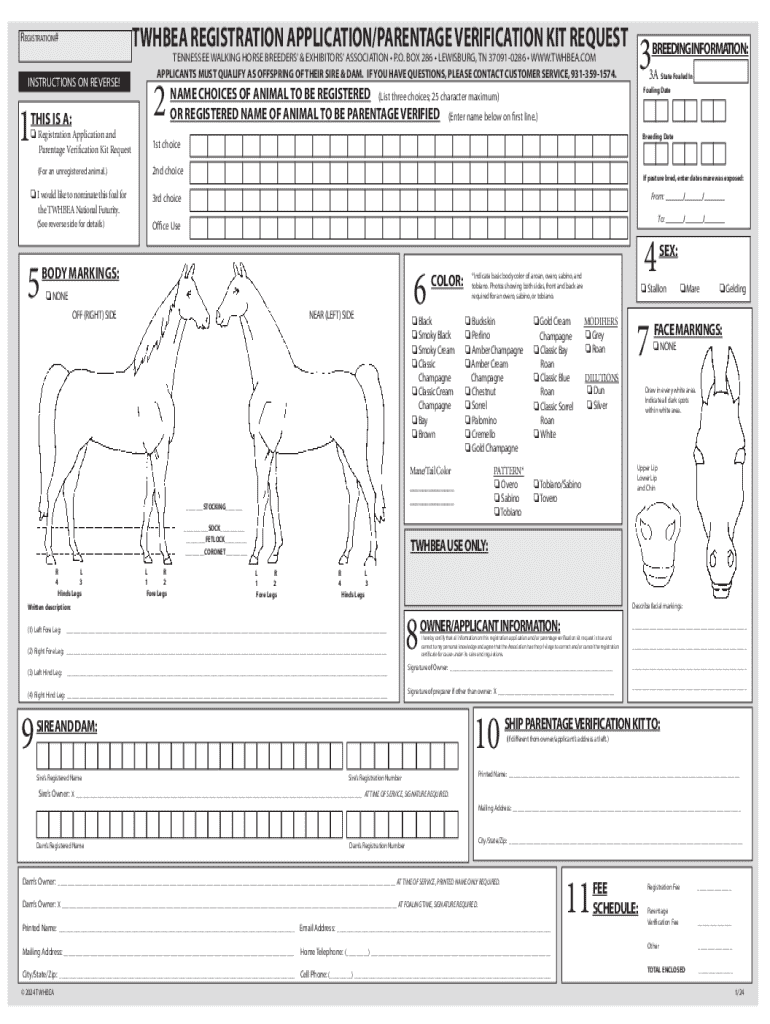 TWHBEA REGISTRATION APPLICATION/PARENTAGE VERIFICATION KIT REQUESTRegistration# INSTRUCTIONS ON REVERSE!1THIS IS A:o Registration Application and Parentage Verification Kit Request (For an unregistered