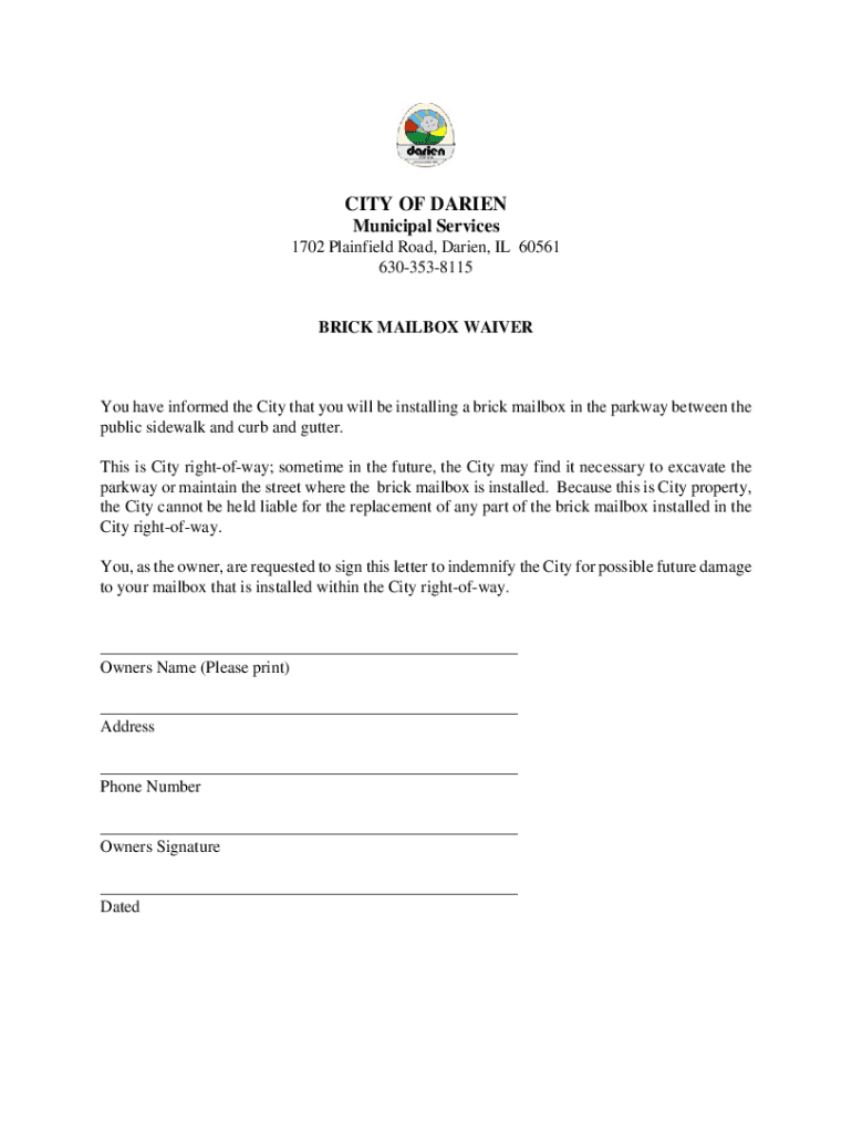 Obtain the brick mailbox waiver form from your local municipality or relevant authority.
