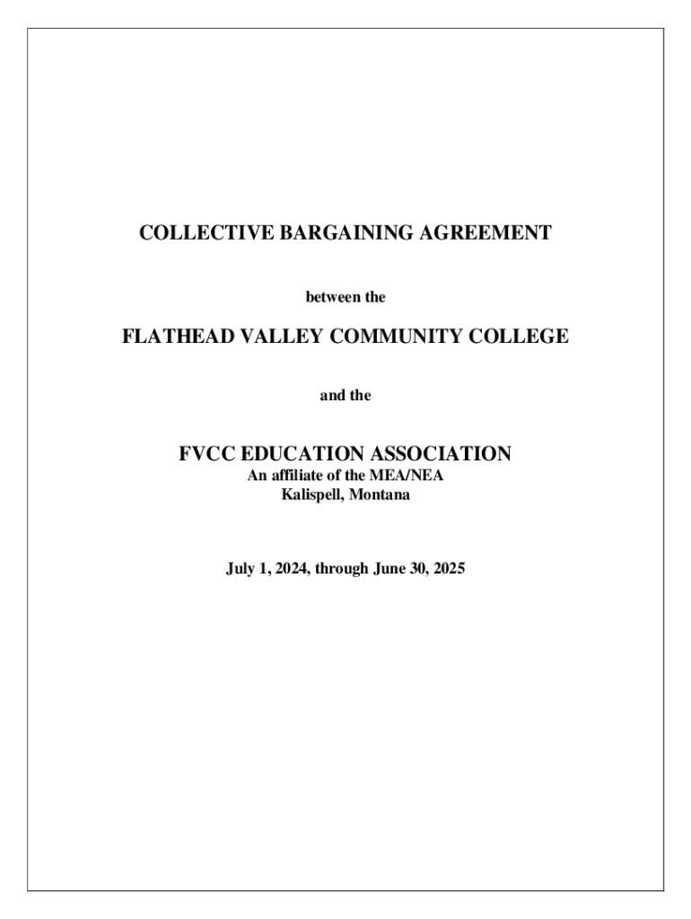 This agreement outlines the terms of employment, rights, and responsibilities for faculty members at Flathead Valley Community College, detailing aspects such as recognition of the association, member