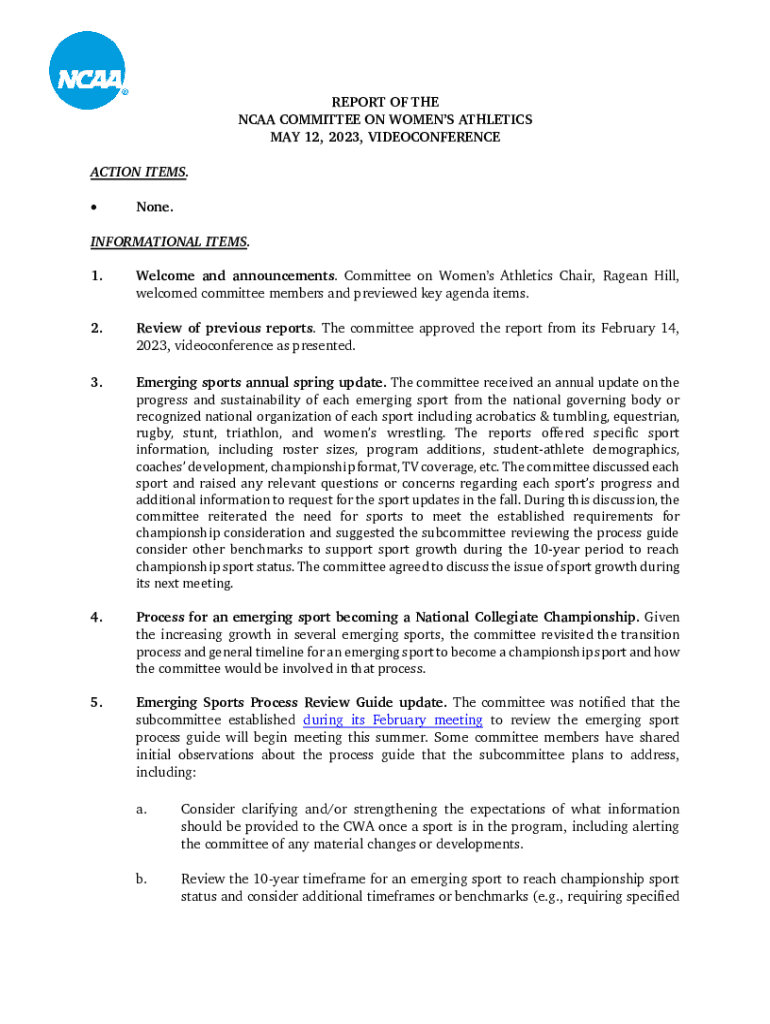 This document contains the minutes from the NCAA Committee on Women’s Athletics meeting held on May 12, 2023, via videoconference. It outlines action and informational items discussed, including
