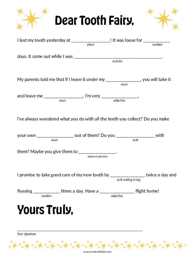 Dear Tooth Fairy, I lost my tooth yesterday at ___! It was loose for ___ placenumberdays. It came out while I was ___. activityMy parents told me that if I leave it under my ___, you will take it