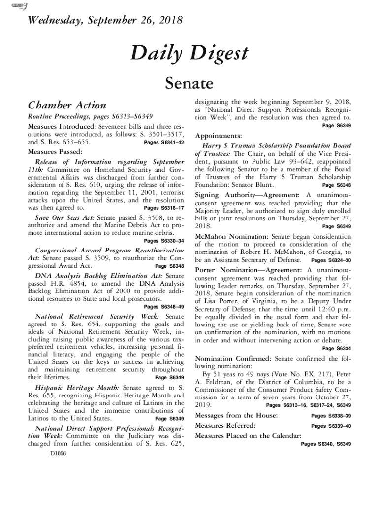 Wednesday, September 26, 2018Daily Digest Senate Chamber Action Routine Proceedings, pages S6313S6349 Measures Introduced: Seventeen bills and three resolutions were introduced, as follows: S. 35013517,