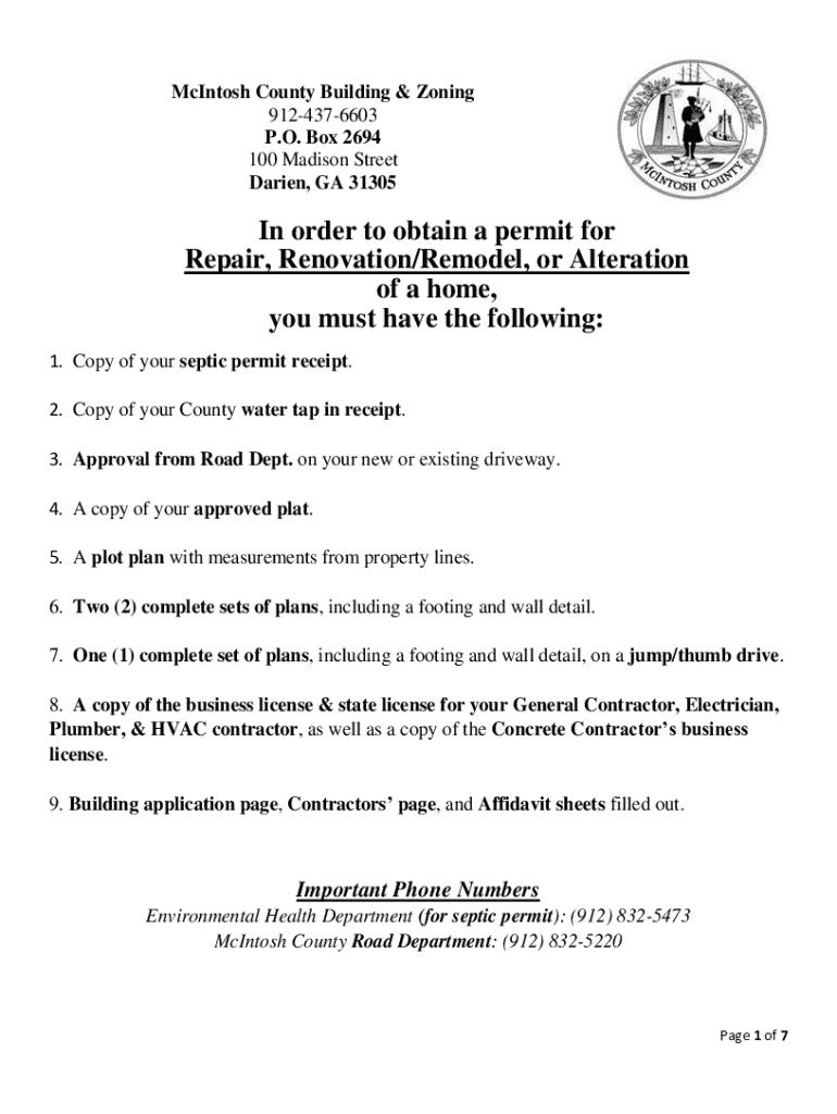 This document outlines the process and requirements for obtaining a permit for repair, renovation, remodel, or alteration of a residential property in McIntosh County, Georgia. It provides a checklist
