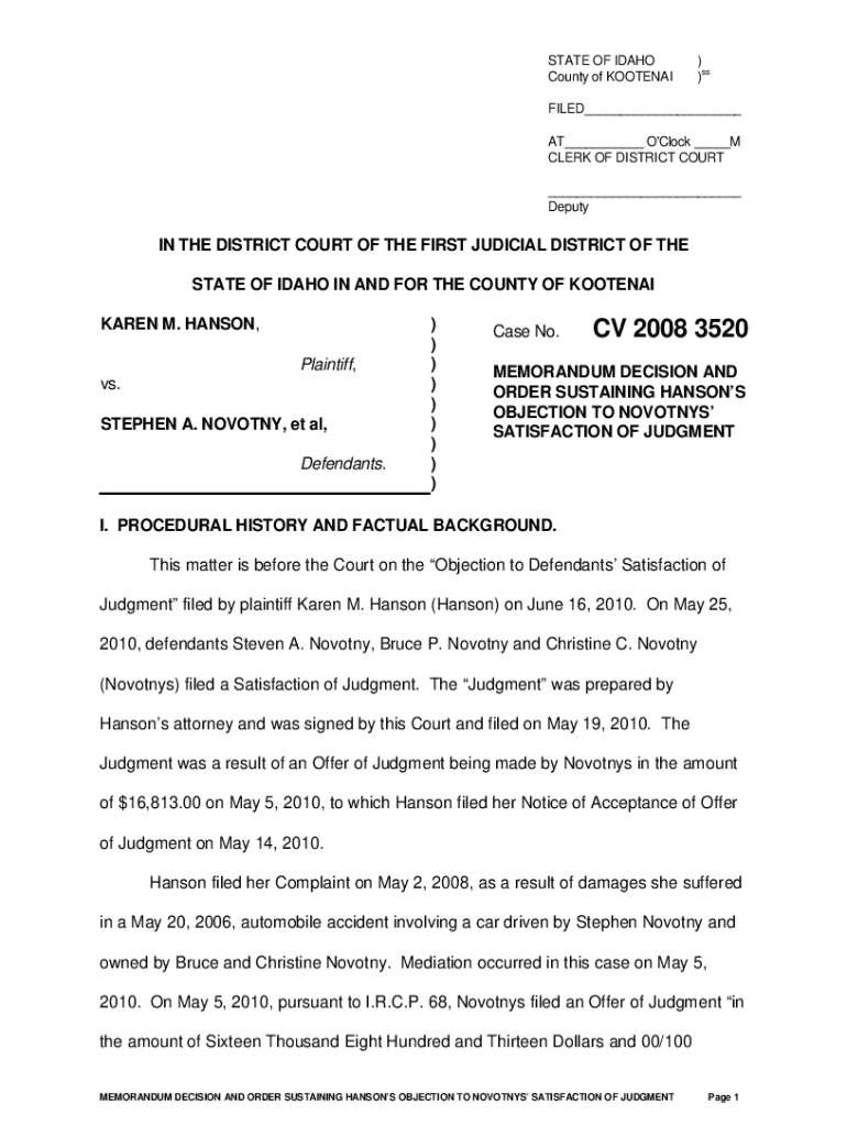 STATE OF IDAHO County of KOOTENAI) )ssFILED___ AT___ O\'Clock ___M CLERK OF DISTRICT COURT ___ DeputyIN THE DISTRICT COURT OF THE FIRST JUDICIAL DISTRICT OF THE STATE OF IDAHO IN AND FOR THE COUNTY
