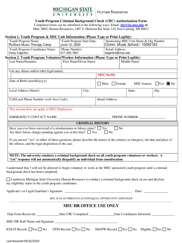 Get the free Youth Program Criminal Background Check (cbc) Authorization Form - cms msu