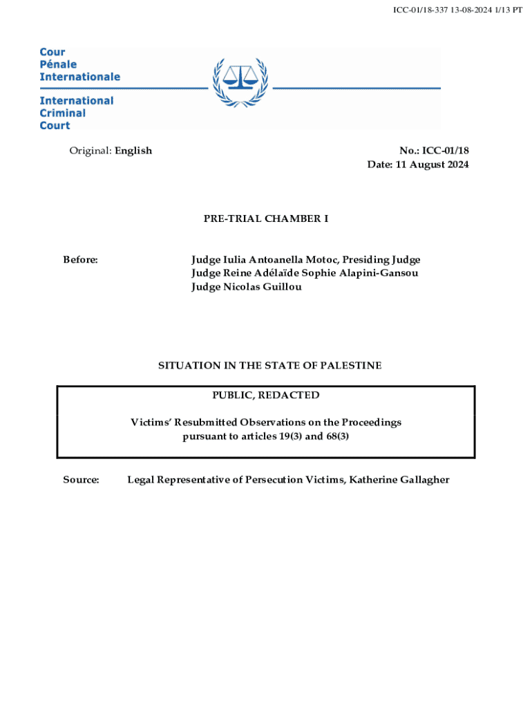 This document presents the resubmitted observations of victims in the state of Palestine regarding the ongoing legal proceedings and the request for arrest warrants against Israeli officials for alleged