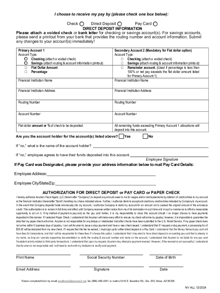 This form allows employees to select their preferred method of receiving paychecks from Acumen, including options for Direct Deposit, Pay Card, or Paper Check. It contains detailed instructions for