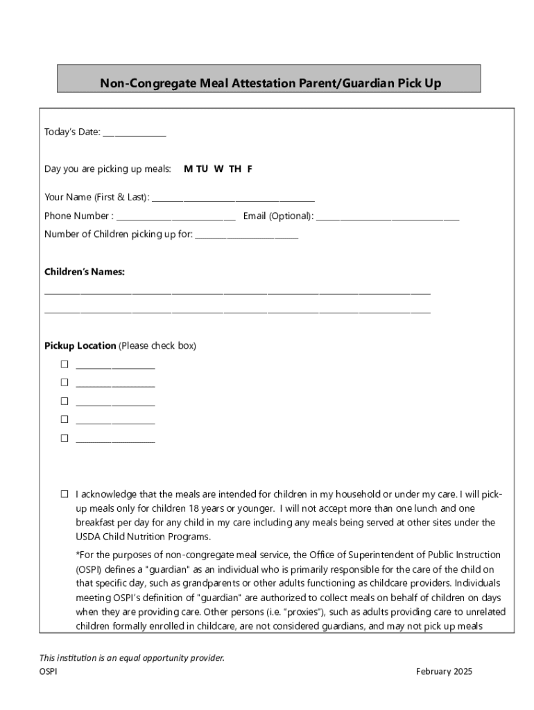 Non-congregate meal attestation parent/guardian is a document or form used by parents or guardians to attest that their child is receiving meals outside of a congregate setting, typically during times when schools are closed or when students are unable to attend school in person.