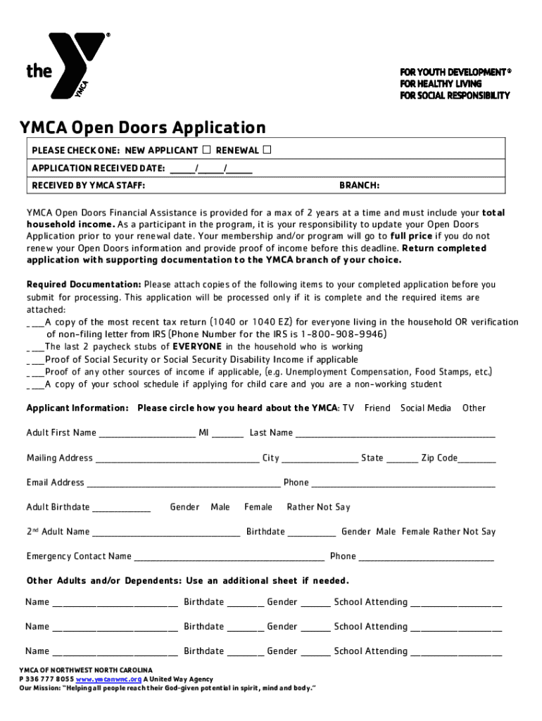 This application is for individuals seeking financial assistance from the YMCA Open Doors program, which provides financial aid for memberships and programs for a maximum of two years based on household