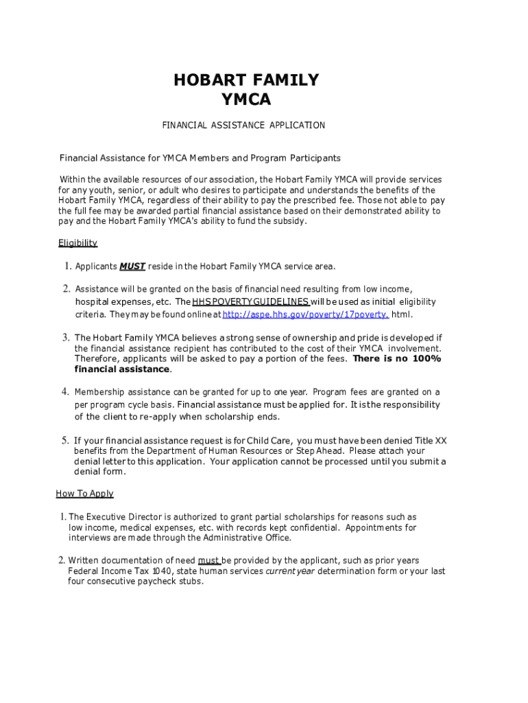 This application allows individuals to request financial assistance for membership and programs at the Hobart Family YMCA, aimed at supporting youth, seniors, and adults who face financial difficulties.
