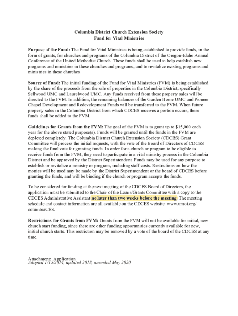 This application is for the Fund for Vital Ministries established by the Columbia District Church Extension Society. It is designed to provide grants for churches and programs within the Columbia
