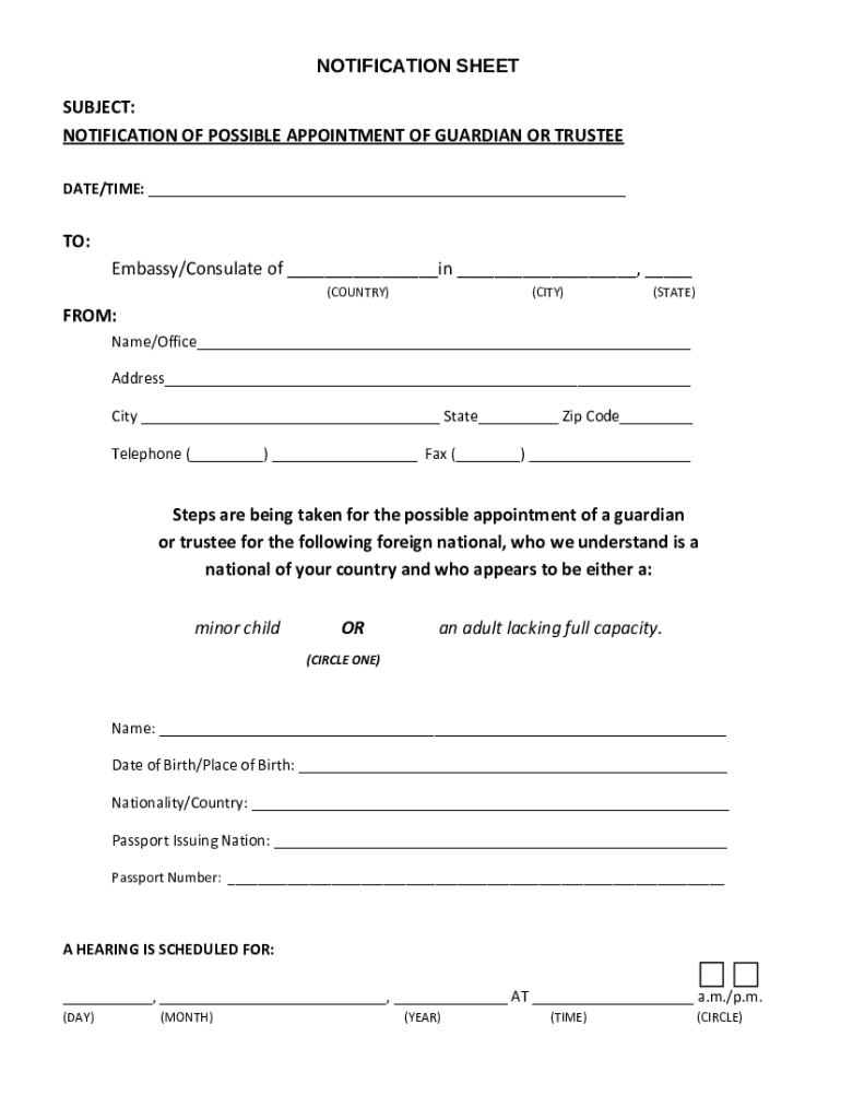 This document serves as a notification regarding the possible appointment of a guardian or trustee for a foreign national, which may concern either a minor child or an adult lacking full capacity.
