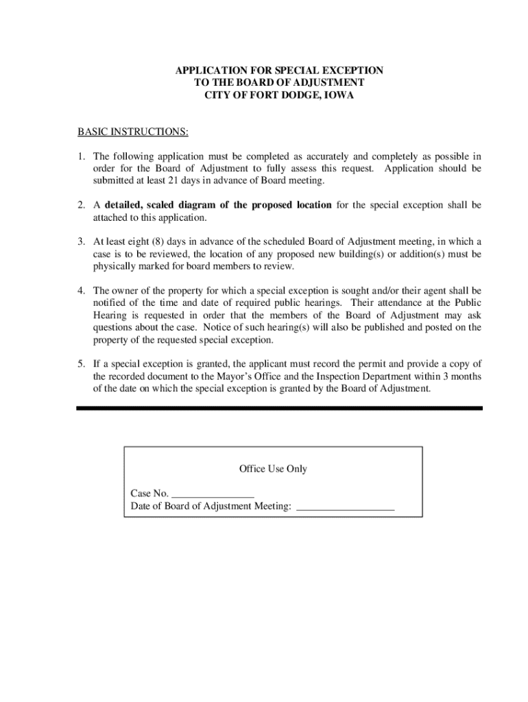 This document is an application form for requesting a special exception to the Board of Adjustment in the City of Fort Dodge, Iowa. It outlines the basic instructions, the information required from